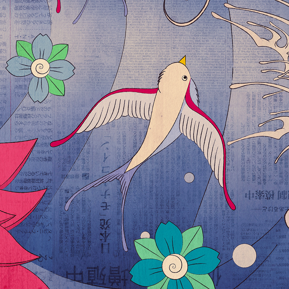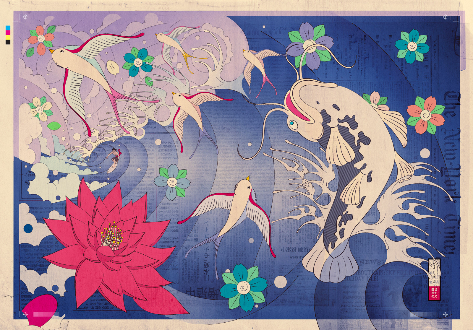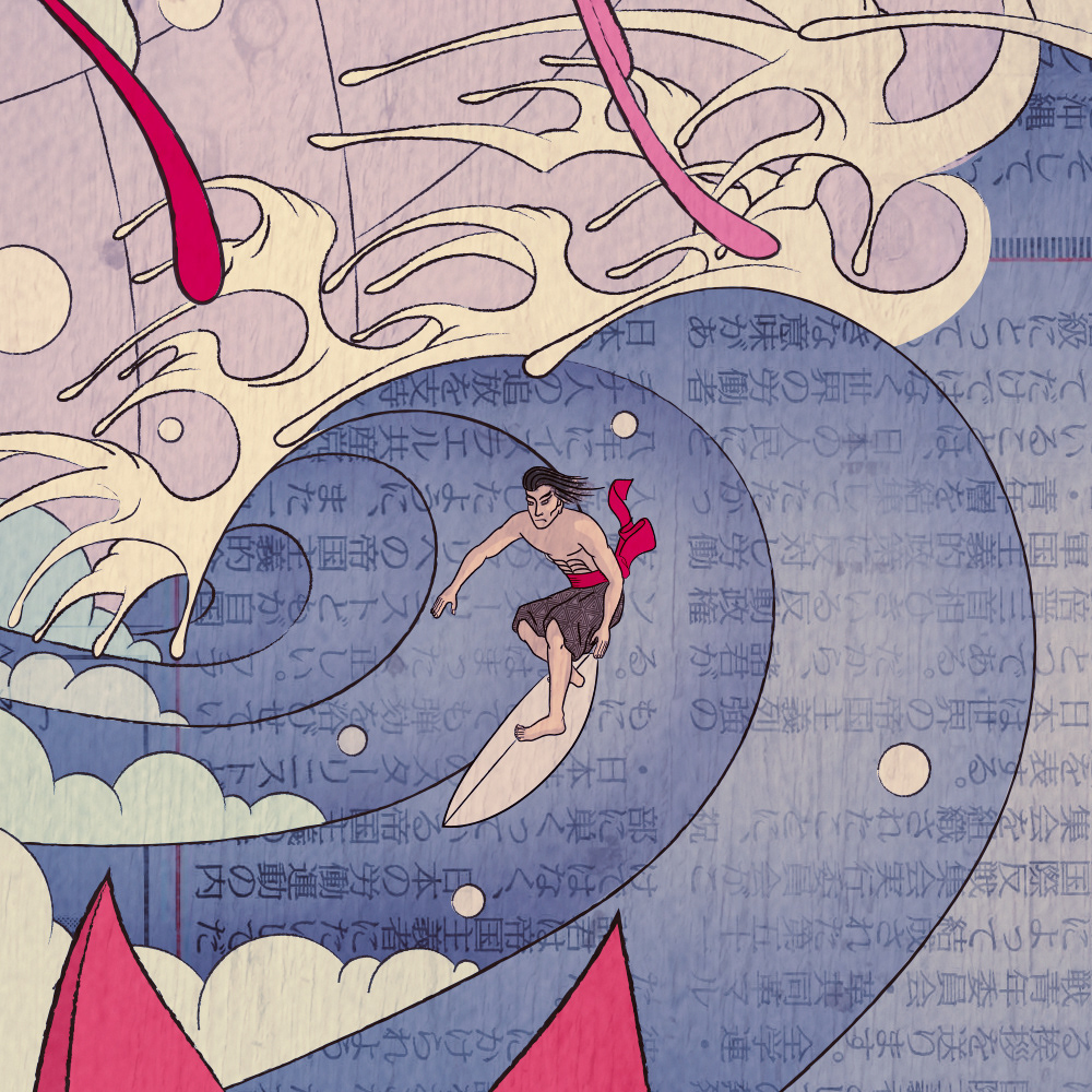 I've long been obssessed with both traditional japanese and americana illustration styles, and here I tried to blend them seamlessly. As a surfer, I also wanted to pay tribute to one of my favorite surfers, Andy Irons, and picture him as a samurai sharing this japanese-style wave with a flock of colorful swallows, sakuras, a beautiful lotus flower and a giant catfish